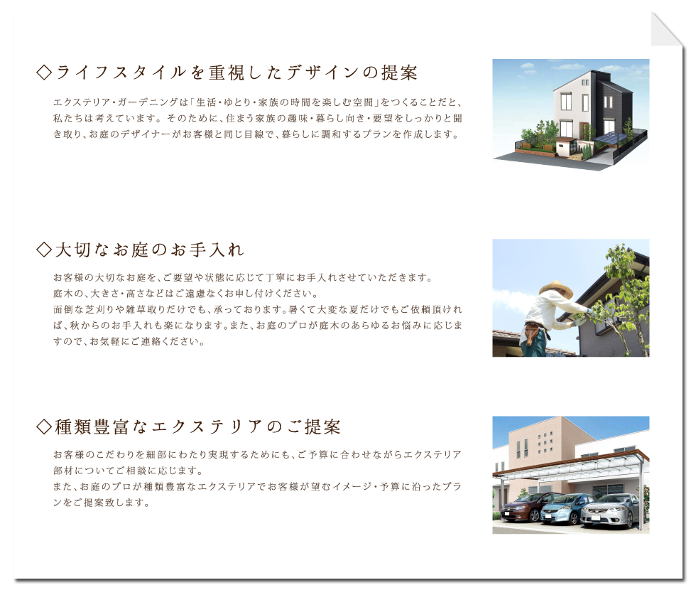 お庭創りをするには、まず庭またはベランダの条件を考えて植物が元気に育つ環境を整えてあげることが大切です。 そのために、敷地の高低差、日当たり、風の入り口、またリビングからの眺め、水はけなどを考えます。 お庭造りは建物や玄関などトータル設計を基本にまわりの環境や風情・調和を保ちつつ、お客様のご要望に豊富なアイデアでご提案致します。